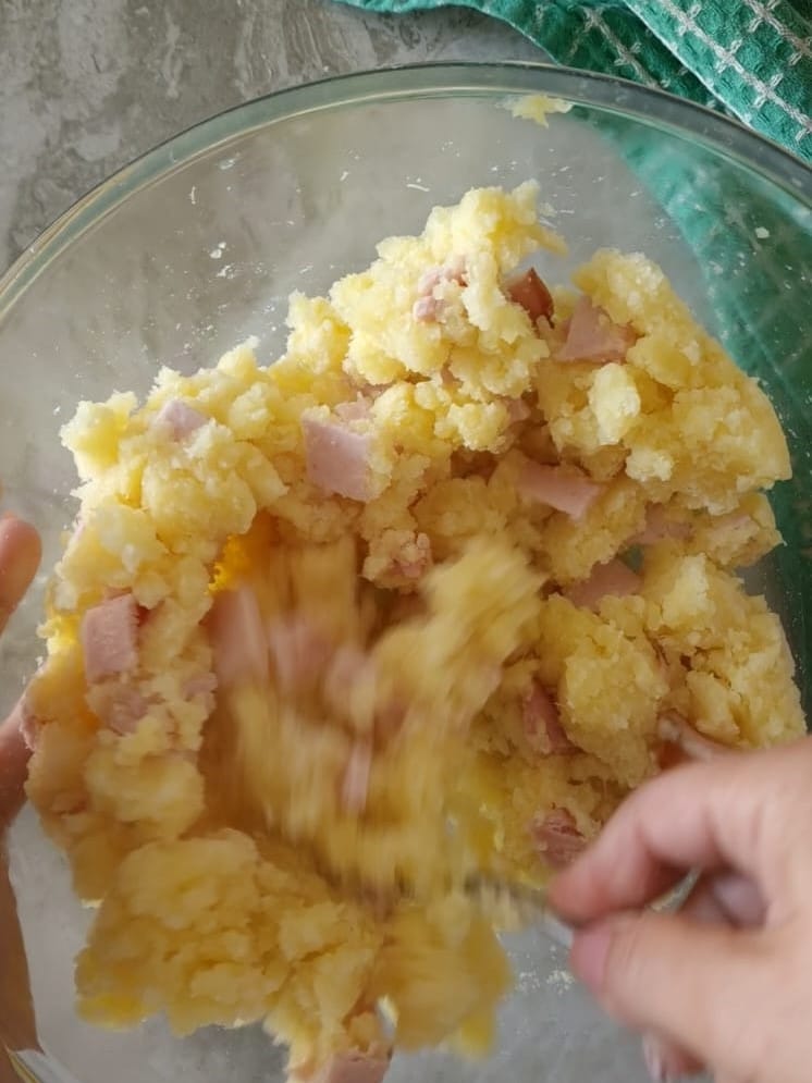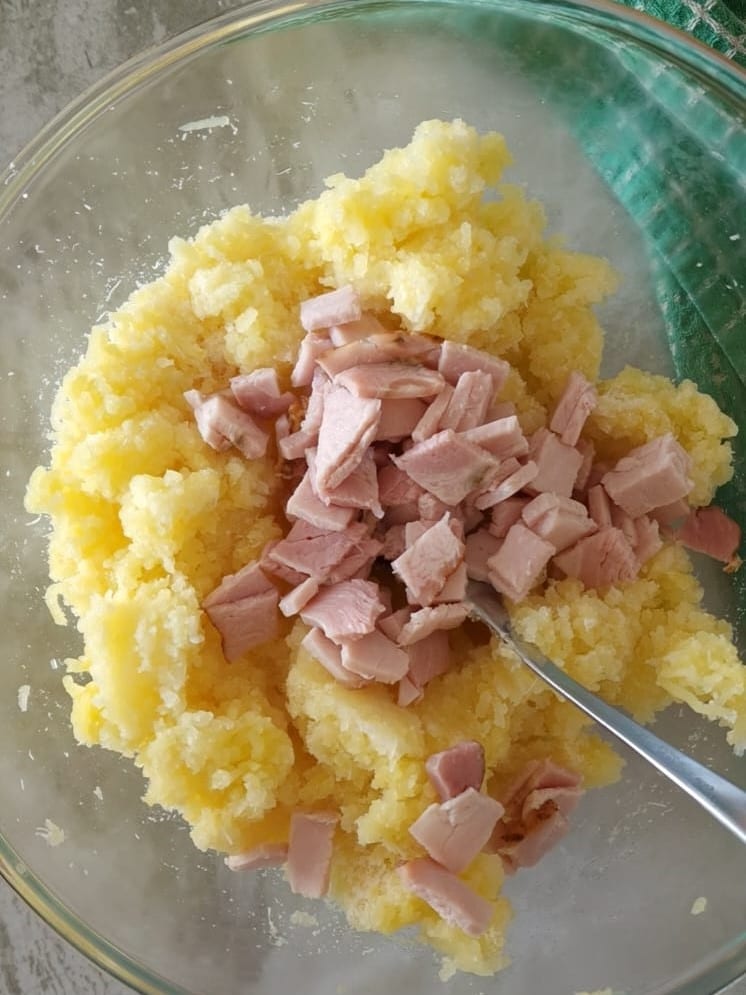 Une fois cuites, écrasez-les avec un presse-purée, ajoutez le parmesan râpé, le sel et le jambon cuit coupé en dés.