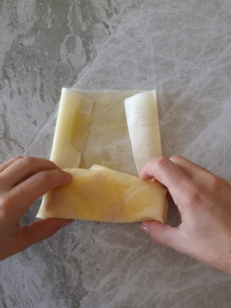 Prenez un peu de farce et garnissez les feuilles de pâte filo. Repliez les deux bords latéraux vers l’intérieur et roulez le rouleau en partant de la base. Répétez les étapes décrites pour le reste des ingrédients.