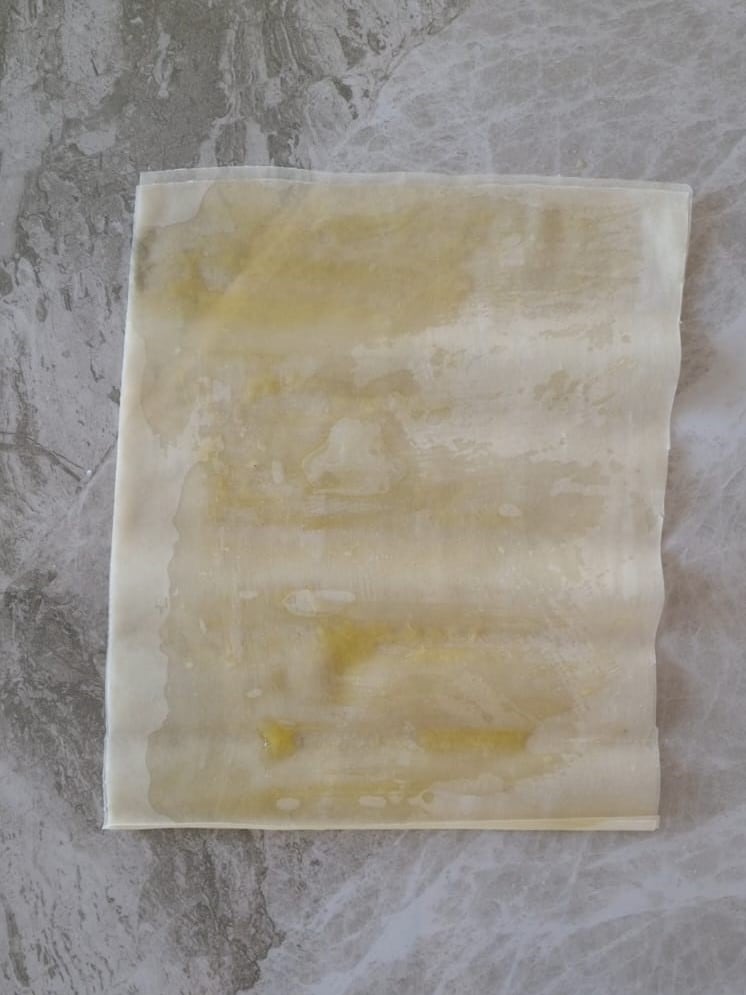 À ce stade, prenez une feuille de pâte filo et découpez-en 2 rectangles. Badigeonnez la première feuille avec un peu de beurre, superposez la deuxième, badigeonnez-la également.