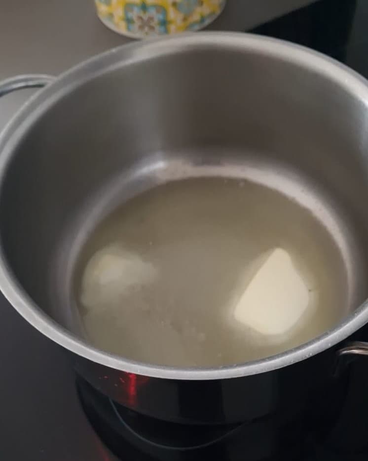 Faites fondre le beurre dans une casserole à feu doux, puis éteignez le feu et versez la farine tamisée en pluie, en mélangeant avec un fouet pour éviter la formation de grumeaux.