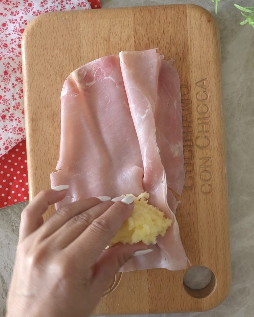 • Étalez les tranches de jambon cuit sur le plan de travail et placez au centre de chaque tranche un peu de purée et un morceau de fromage.