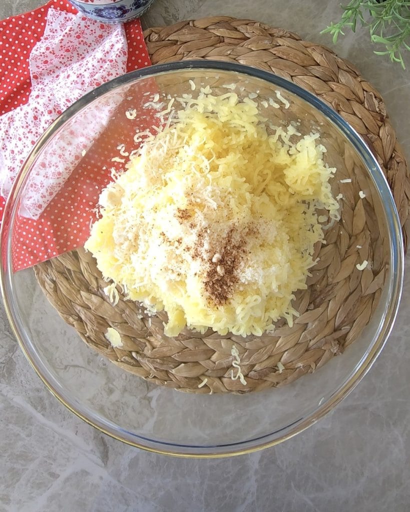• Ensuite, ajoutez le sel, le parmesan, la noix de muscade et l’œuf, et mélangez bien le tout avec une fourchette.