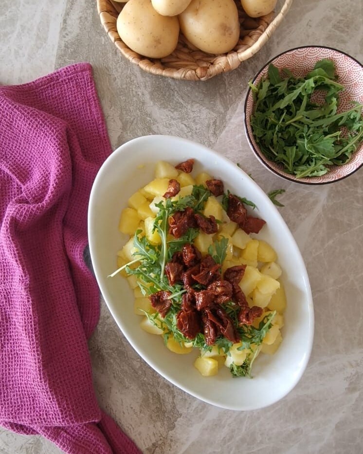 Salade de pommes de terre avec jambon et roquette est un plat principal exceptionnel, facile et savoureux à servir frais. Recette rapide, à préparer même la veille, pour la déguster ensuite au bureau ou à la mer. On commence par cuire les pommes de terre à l’eau puis on les laisse refroidir, on assemble la salade avec du jambon cuit, éventuellement remplaçable par du speck, des tomates séchées et de la roquette, puis on assaisonne avec de l’huile d’olive extra vierge. Vous pouvez personnaliser la salade en ajoutant ou en remplaçant les ingrédients que vous préférez. Maintenant je vous laisse à la recette, n’oubliez pas de me suivre sur mes pages sociales Facebook et Instagram.