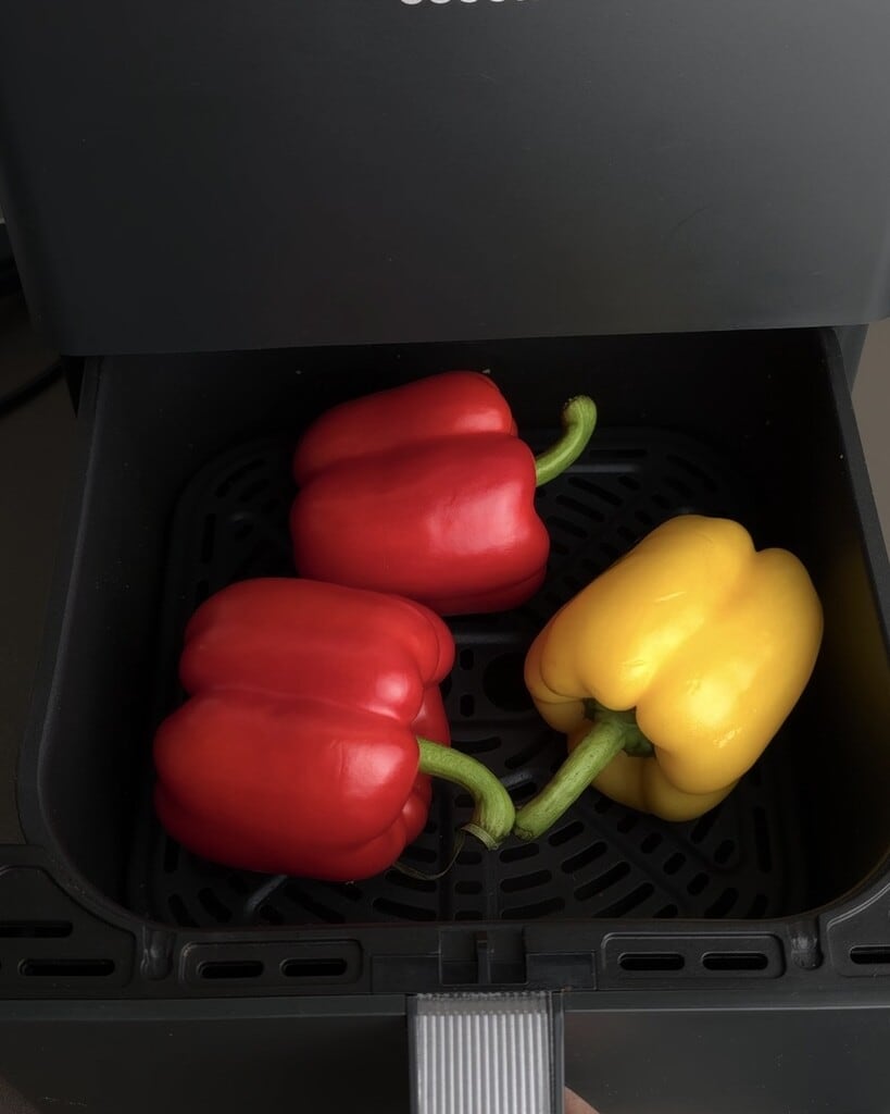 Commencez par mettre les poivrons dans le panier de la friteuse à air, faites cuire à 200°C pendant environ 20 minutes, en veillant à les retourner à mi-cuisson.