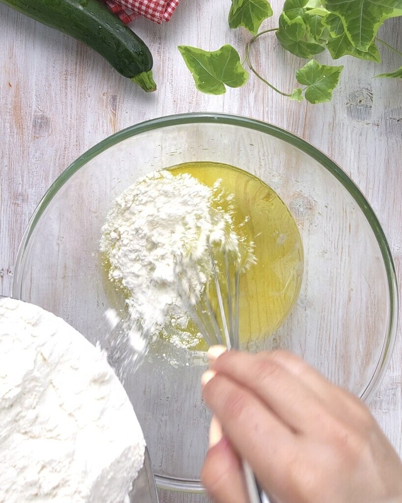 On la prépare en râpant les courgettes et les pommes de terre, tandis qu’à part, on mélange farine, eau, sel et huile.