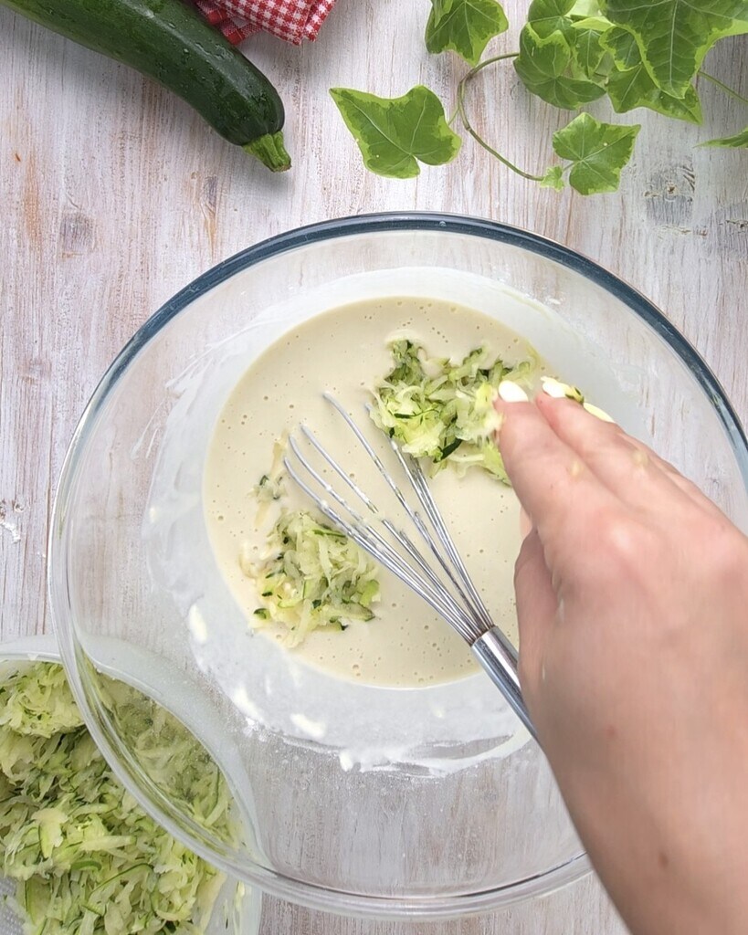 Mélangez très rapidement jusqu’à obtenir une pâte lisse et sans grumeaux, puis ajoutez les courgettes et les pommes de terre bien essorées.
