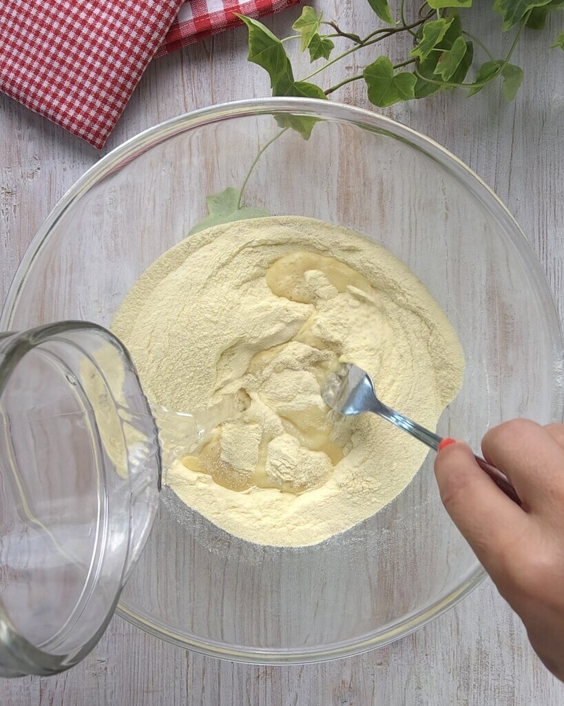 Disposez la farine dans un saladier, ajoutez la levure. Versez l’eau tiède petit à petit et mélangez avec une fourchette.