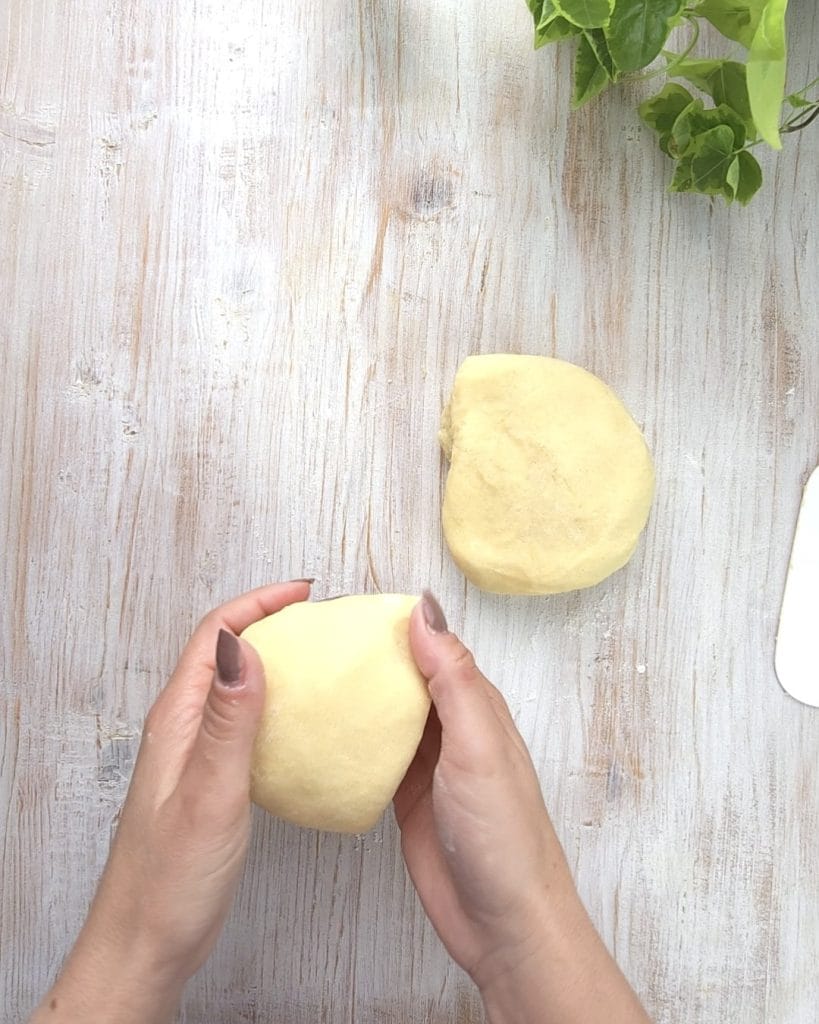 Une fois le tout compacté, transférez sur le plan de travail et travaillez jusqu’à obtenir une pâte douce et compacte. Divisez le pâton en deux et enveloppez-les dans un film alimentaire, en les laissant reposer pendant 1 heure au réfrigérateur.