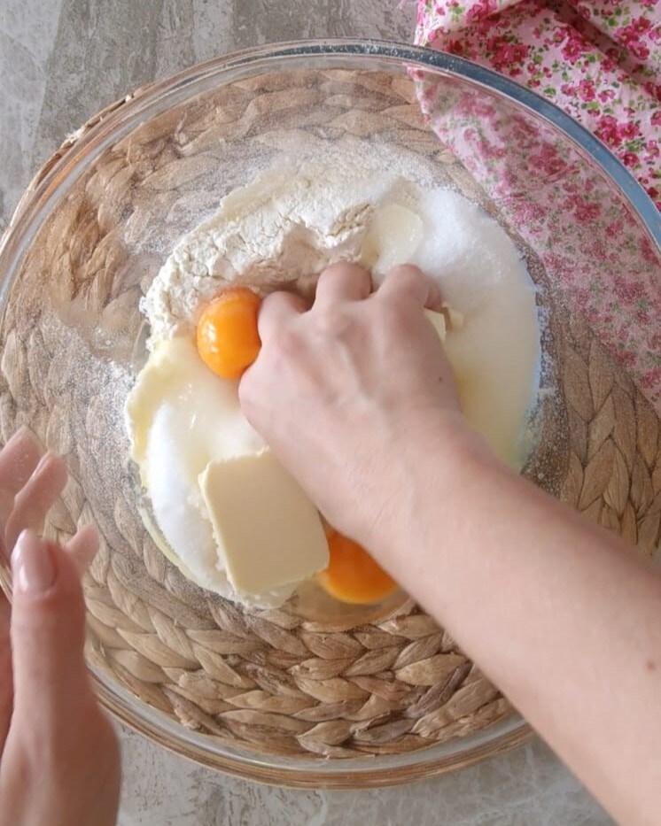 Pour faire la tarte anneau, mettez dans un bol la farine, la levure, les œufs et le beurre.