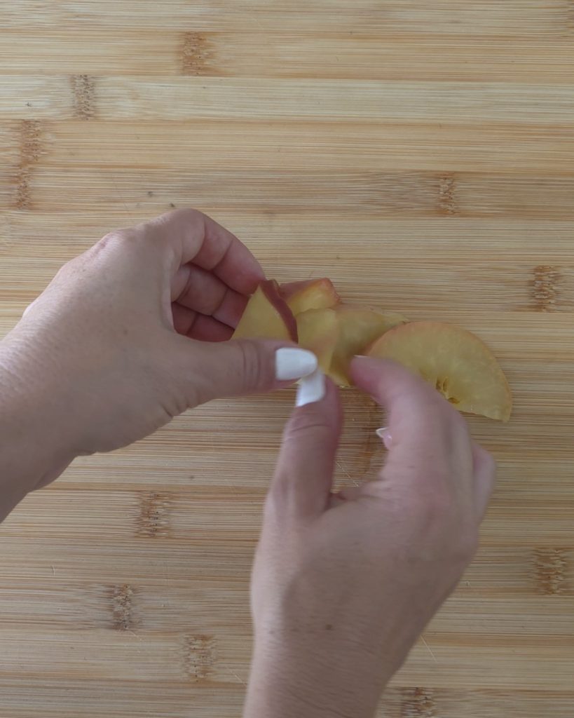 • À ce stade, avec le reste des pommes, créez vos petites roses en superposant 5 tranches l’une à côté de l’autre.
