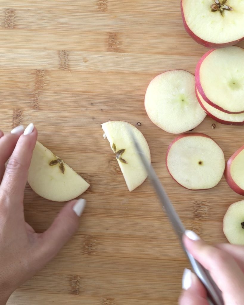 • Coupez 4 pommes rouges, divisez en deux, ôtez le trognon et coupez-les en fines tranches, environ 2 mm. Pour cette opération, vous pouvez utiliser une mandoline ou un simple couteau.