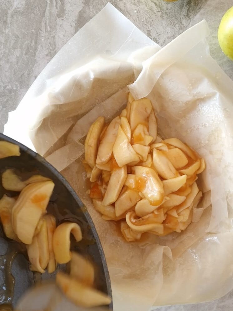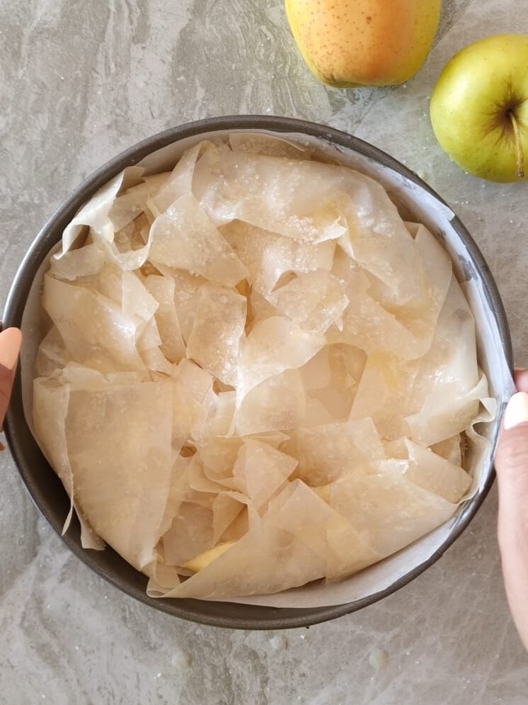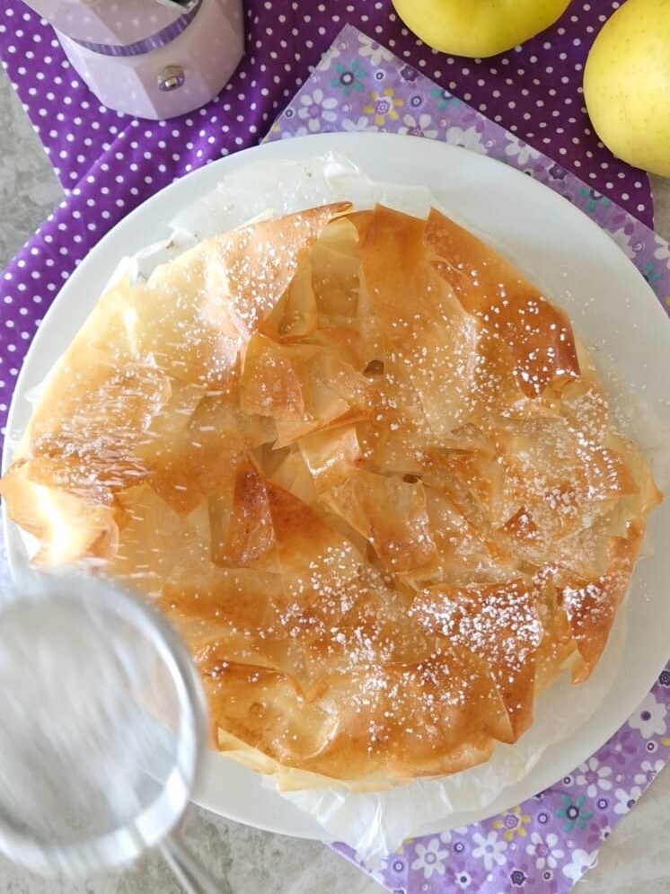 La tarte aux pommes croustillante avec pâte filo est un dessert incroyable ! Recette facile et rapide, un dessert aux pommes qui n’a rien à envier à la classique tarte aux pommes ou à la tarte aux pommes invisible. Dans ma version, je réalise la garniture en cuisinant les pommes à la poêle, avec du sucre et de la confiture, mais il est également possible de ne pas cuire les pommes, de les ajouter à la base, et au reste des ingrédients, pour ensuite cuire le tout ensemble, économisant ainsi un temps précieux.