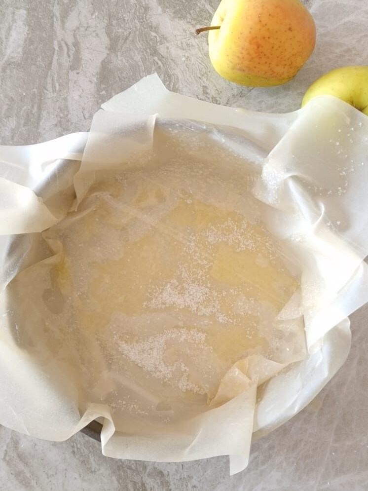Prenez une feuille de pâte filo, placez-la dans un moule à charnière, badigeonnez de beurre et saupoudrez un peu de sucre, couvrez avec une autre feuille de pâte. Continuez la séquence, trois fois, en tournant légèrement la position, vous aurez ainsi 6 couches de pâte filo beurrée et sucrée.