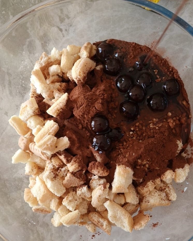 Entre-temps, préparez la garniture en mettant dans un bol les biscuits émiettés, les cerises griottes, le cacao, le granola de noisettes et la confiture. Mélangez le tout jusqu’à obtenir un mélange homogène.