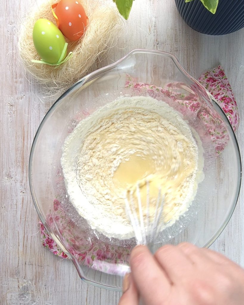 Ajoutez le lait et l’huile en filet tout en continuant à mélanger, ajoutez également la farine tamisée, le parmesan et la levure.