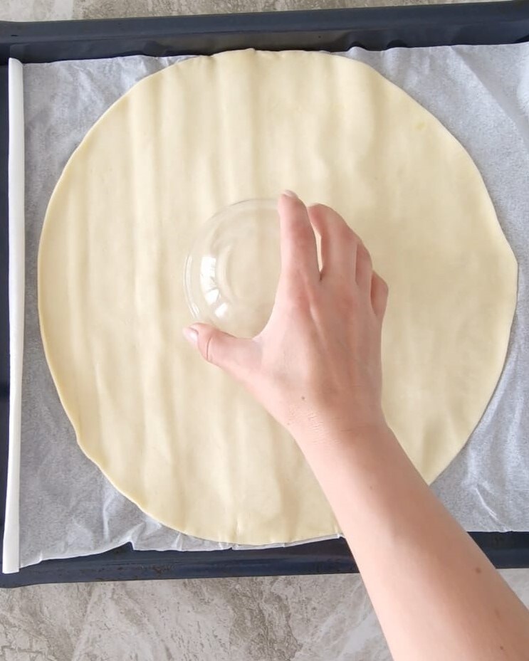 Déroulez la pâte feuilletée sur une plaque de cuisson. Placez au centre un bol (ou une grande tasse), retourné vers le bas, en appuyant légèrement.