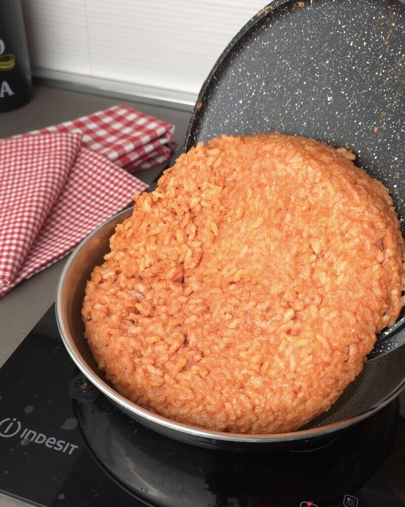 À ce stade, huilez et saupoudrez de chapelure une poêle de 24 cm, puis versez la moitié du riz et nivelez bien.