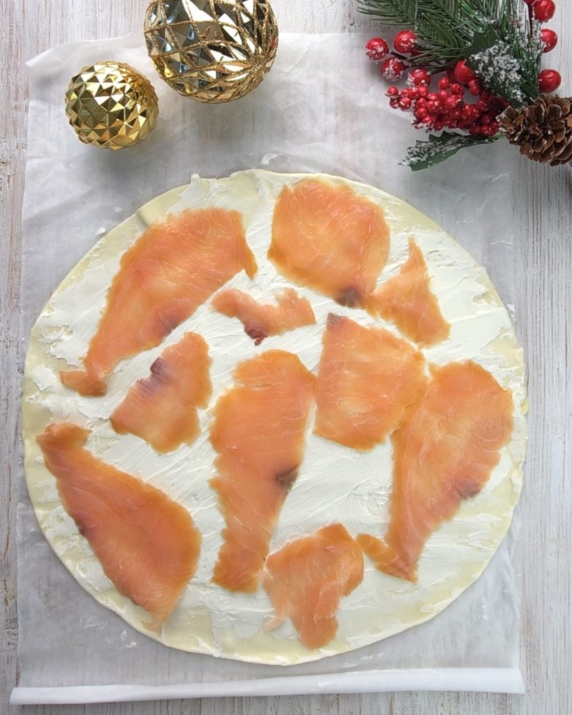 Garnissez-le de fromage à tartiner type Philadelphia et de saumon en laissant environ un centimètre libre à l’extrémité de la pâte.