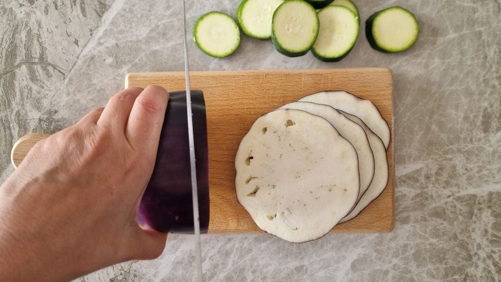 Pendant ce temps, couper l’aubergine et la courgette en tranches fines.