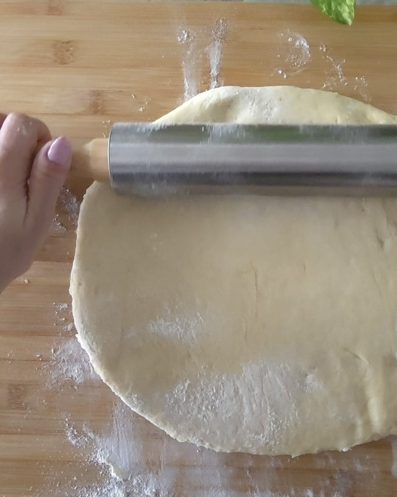 Reprenez la pâte levée, placez-la sur le plan de travail légèrement fariné et étalez-la avec un rouleau à pâtisserie pour obtenir un rectangle d’environ un demi-centimètre d’épaisseur.