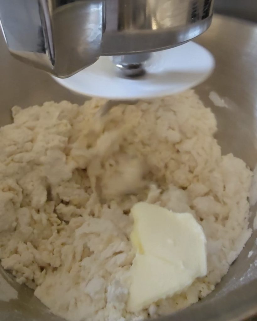 À ce stade, versez le lait et l’œuf, puis ajoutez le beurre mou coupé en morceaux et pétrissez bien le tout.