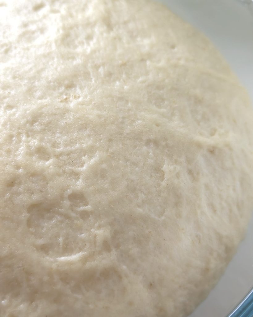 Transférez le tout sur le plan de travail et formez une boule lisse et douce. Laissez reposer dans un bol couvert de film plastique pendant environ 2 heures pour doubler de volume.