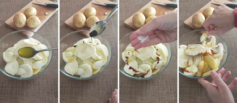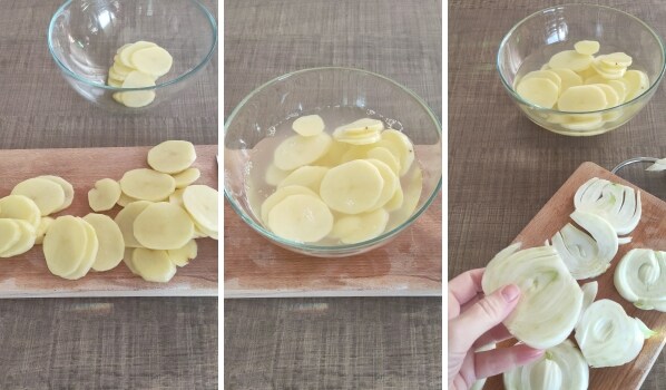 • – Laver les pommes de terre, les éplucher et les couper en fines tranches. Les laisser tremper dans l’eau froide pour éliminer un peu d’amidon et pendant ce temps, couper le fenouil en tranches après avoir retiré les parties terreuses et les fanes.