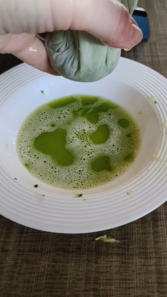 Placer la julienne de courgette dans une gaze et presser soigneusement pour éliminer toute l’eau de végétation.