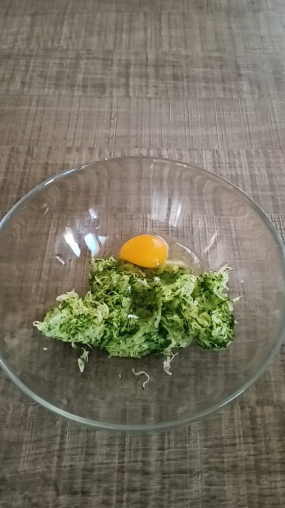 Transférer les courgettes dans un bol, ajouter l’œuf et mélanger à la fourchette.