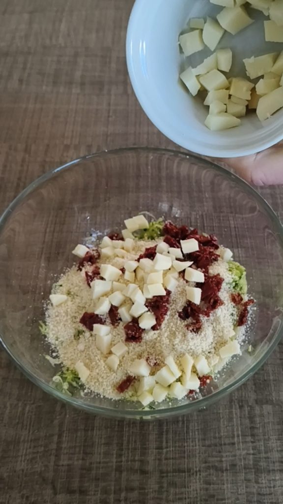 Ajouter les poudres, les tomates séchées bien essuyées et coupées en petits morceaux, et la scamorza coupée en petits dés. Saler, poivrer et bien mélanger.
