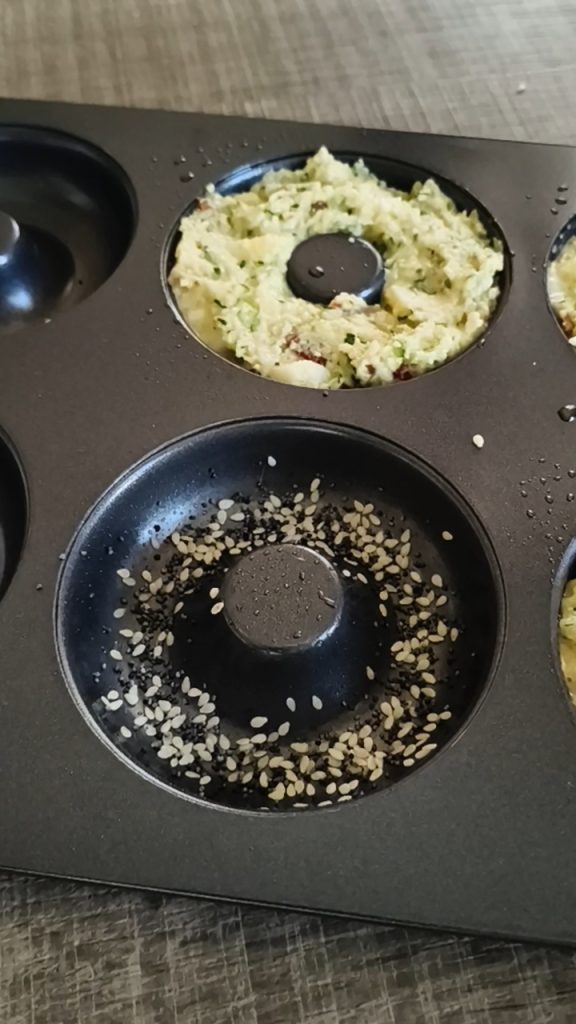 Dans cette version, j’ai choisi d’utiliser de la farine d’amandes, qui apporte une texture moelleuse et une saveur délicate, en enrichissant la préparation avec de la mozzarella en dés et des tomates séchées pour une touche plus savoureuse. Le résultat est des bagels courgettes et amandes au four, moelleux et faciles, salés et hauts, idéaux à déguster tout juste sortis du four ou coupés en deux et garnis comme de petits sandwichs.