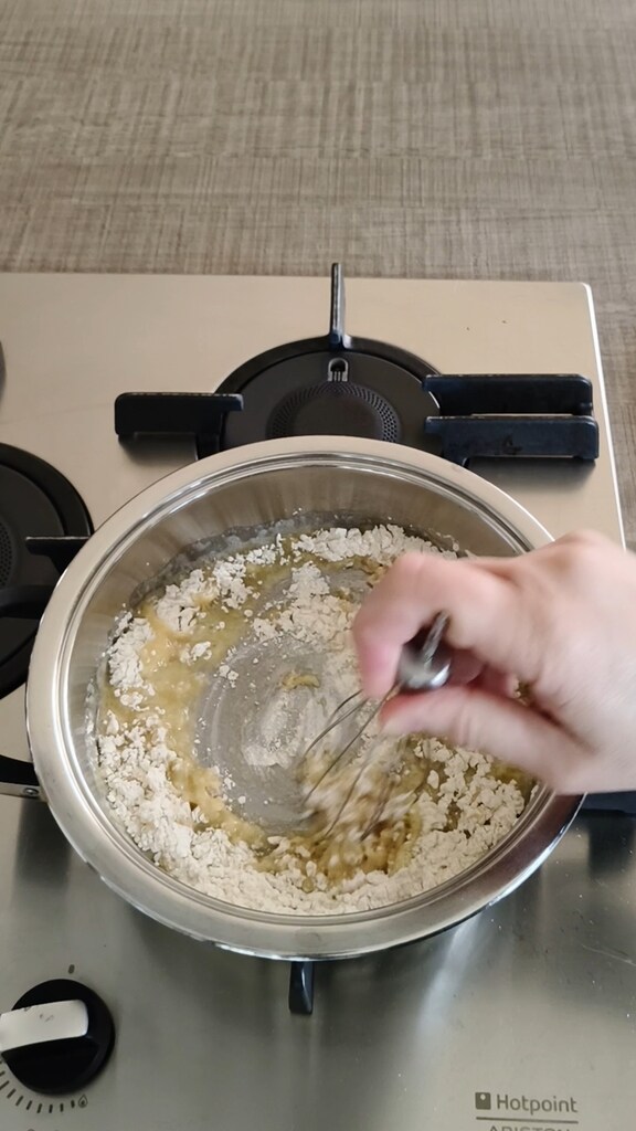 Ajouter la farine préalablement tamisée et mélanger avec le fouet jusqu’à obtenir une pâte (roux) granuleuse.
