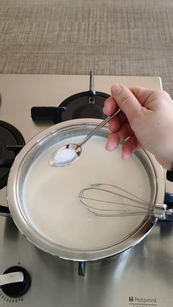 Verser le lait chaud et ajouter le sel.