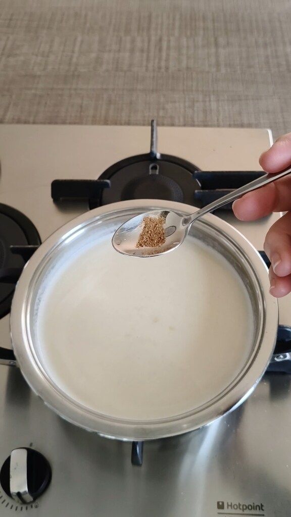 Commencer à mélanger avec le fouet et ajouter également la noix de muscade et le poivre.