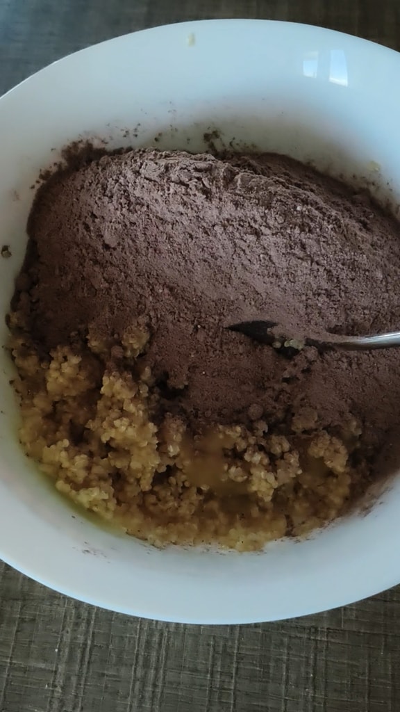 – Dans un bol plus grand, verser la quinoa froide, ajouter l’huile, la compote de pomme et mélanger. Puis ajouter les poudres. La pâte se compacte facilement à la main.