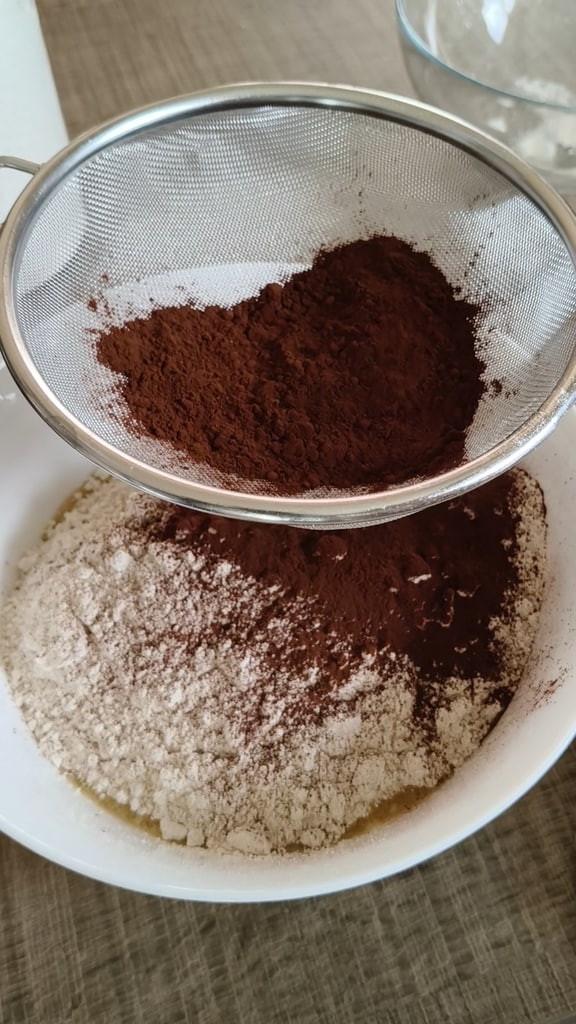 Ajouter la farine déjà tamisée, le cacao et les pépites de chocolat.