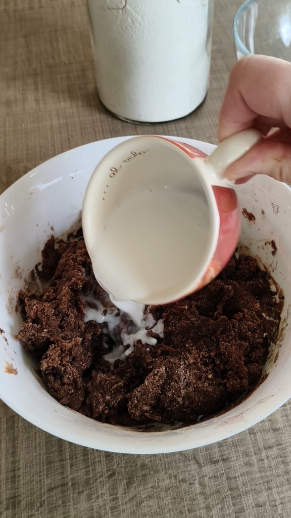 Pétrir brièvement et ajouter le lait tiède dans lequel on a dissous l’ammoniaque pour pâtisserie.