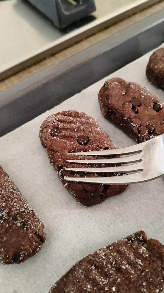 Avec une fourchette, strier les biscuits à tremper au chocolat puis les cuire environ 15 minutes. Après la cuisson, les laisser au four environ 5 minutes avec la porte entrouverte, puis les laisser refroidir sur une grille à gâteaux.