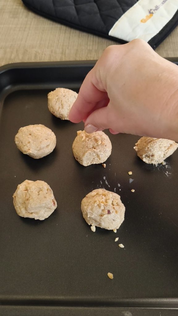 Former des boules sur la plaque du four (pas besoin de graisser); garnir la surface avec des éclats.