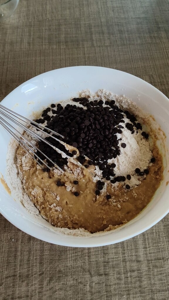 Verser la farine en 2 fois et ajouter les pépites de chocolat noir.