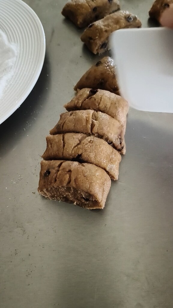 Compacter la pâte, la passer sur le plan de travail légèrement fariné et former des boudins pour découper les biscuits.