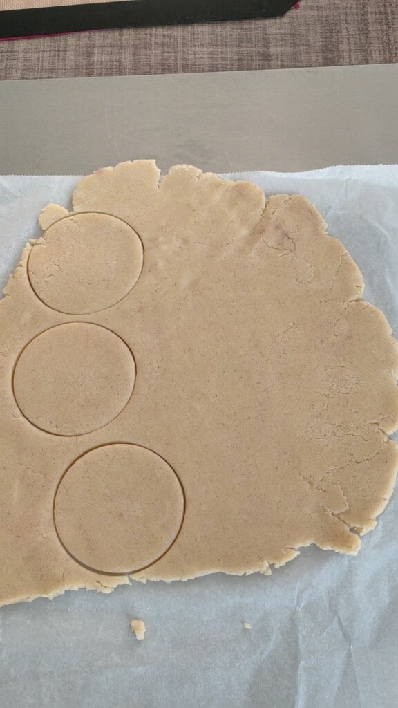 – Étalez la pâte sablée et découpez 6 pièces de diamètre suffisant pour couvrir vos tasses (un verre sera parfait si vous n’avez pas l’emporte-pièce adapté); placez les biscuits sur le tapis ou la feuille de papier sulfurisé et mettez-les au réfrigérateur en attendant que le four atteigne la température.