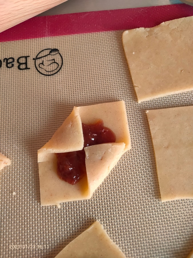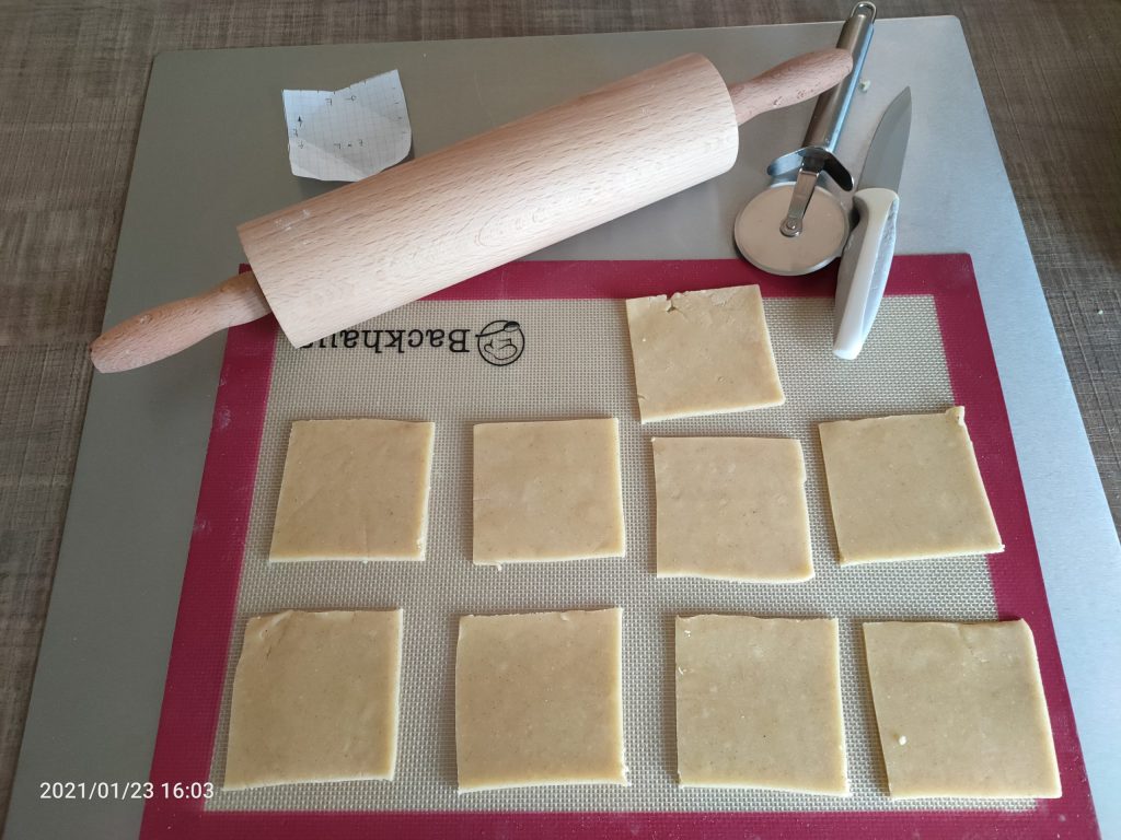 – Préparer la pâte sablée, laissée reposer un jour au réfrigérateur, puis l’étaler finement et découper les carrés. (si vous n’en avez pas besoin de toute, vous pouvez la congeler)