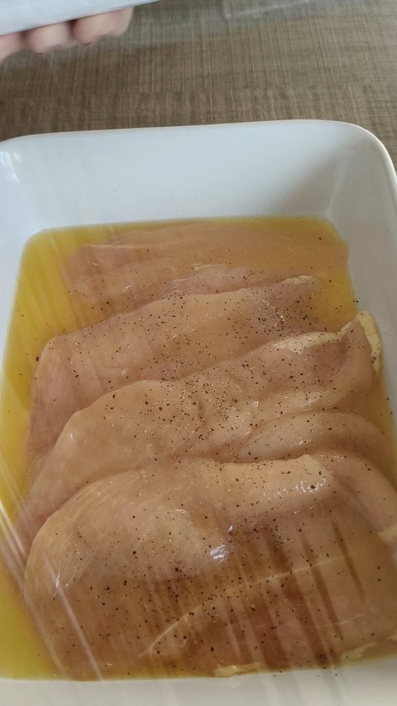 • Placer la viande dans un plat, arroser avec l’émulsion, poivrer et couvrir avec du film plastique. Mettre au réfrigérateur pendant environ une demi-heure.