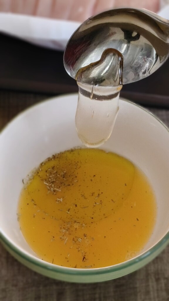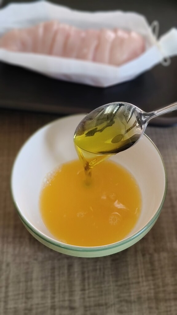 Préparez une émulsion en ajoutant deux cuillères à soupe d’huile au jus d’orange.
