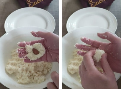 – Prélever une petite quantité de pâte, mettre une amande au centre et fermer en formant une boule.