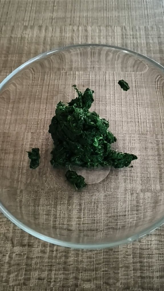 Faire cuire les épinards à la poêle avec un filet d’eau, à couvert, pendant quelques minutes. Les laisser tiédir ou refroidir puis bien les essorer pour enlever toute l’eau.