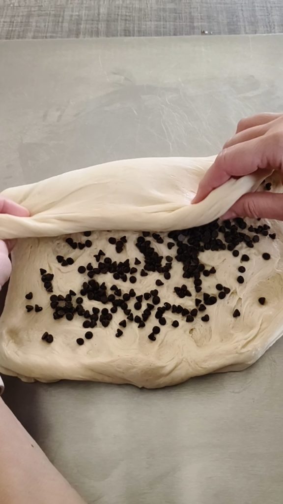 • Reverser la pâte sur le plan de travail légèrement huilé, étaler en rectangle délicatement et répartir les pépites de chocolat. Fermer en boudin, puis en escargot.