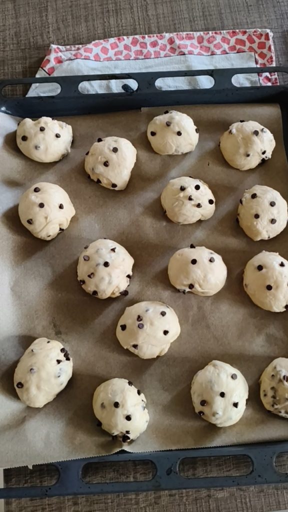 • Disposer les boules sur la plaque recouverte de papier sulfurisé et, si vous le souhaitez, vous pouvez répartir quelques pépites de chocolat sur la surface des boules.