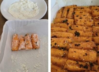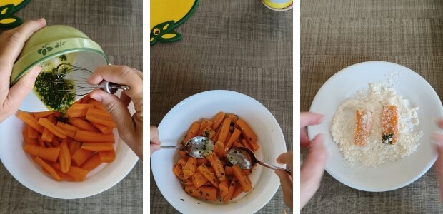 – Passer les morceaux de carottes dans un grand bol, assaisonner avec la marinade et bien mélanger. Verser une quantité de parmesan suffisante pour paner les bûchettes.